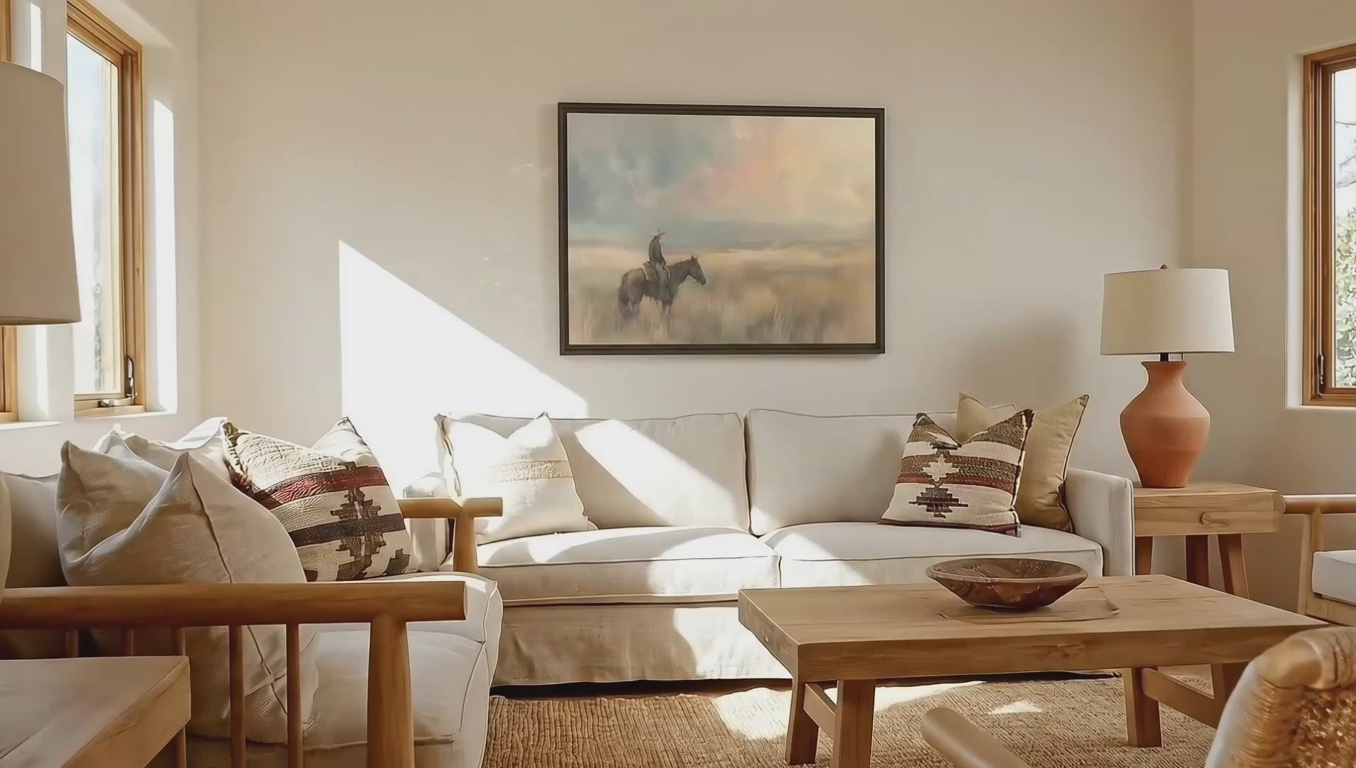 A lone cowboy gazes over the valley in Billings, Montana, this framed canvas captures a timeless moment of a cowboy riding off in to the sunset in Montana. Featuring soft pastels and open plains, it's a serene yet rugged choice for rustic offices, country farmhouses, or western bedrooms. Its muted palette makes it equally at home in guest rooms or ranch-style living spaces. An ideal gift for western collectors or anyone who loves the spirit of the West. "Vintage Cowboy" v.2